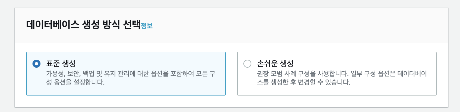 AWS ์ ์ ํ ์๋น์ค ๊ฒ์์ฐฝ์ RDS๋ฅผ ๊ฒ์ ํ ์ด๋ํ์ฌ ๋ฐ์ดํฐ๋ฒ ์ด์ค ์์ฑ์ ํด๋ฆญํ๋ค.