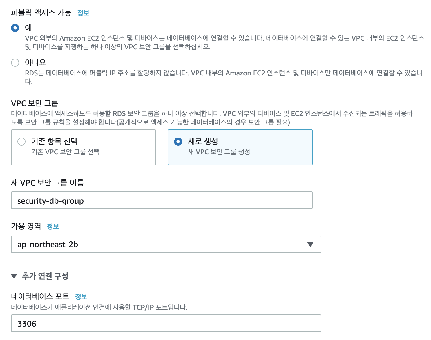์ธ๋ถ์์ ์ ์ํ ์ ์๊ฒ ํผ๋ธ๋ฆญ ์ก์ธ์ค ๊ธฐ๋ฅ์ ์๋ฅผ ์ ํํ๊ณ VPC ๋ณด์ ๊ทธ๋ฃน์ ์๋ก ์์ฑ์ ์ ํํ ๋ค ๋ณธ์ธ์ด ์๋ณํ ์ ์๋ ๋ณด์ ๊ทธ๋ฃน ์ด๋ฆ๊ณผ ๊ฐ์ฉ ์์ญ์ ๋ฆฌ์ ๊ณผ ์ผ์น์์ผ์ค๋ค.