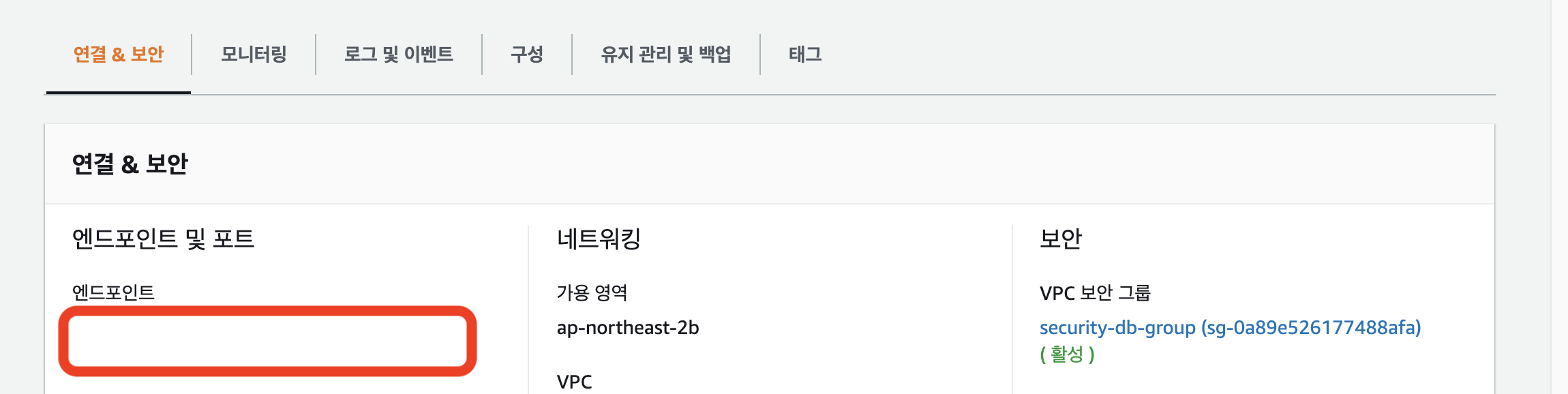 DB ์์ฑ์ด ์๋ฃ๋๋ฉด DB๋ฅผ ํด๋ฆญํ ๋ค ํ๋จ์ ์ฐ๊ฒฐ & ๋ณด์ ํด๋ฆญ ํ VPC ๋ณด์ ๊ทธ๋ฃน์์ ์์ฑ ๋ ๋ช
