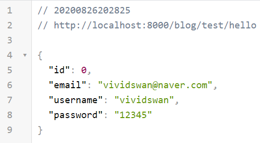 ์ ์ปจํธ๋กค๋ฌ์ hello ๋ฉ์๋๋ฅผ ์ด์ง ๋ฐ๊ฟ์, ๋ฉค๋ฒ๋ผ๋ ๊ฐ์ฒด๋ฅผ return ํด๋ณด์.